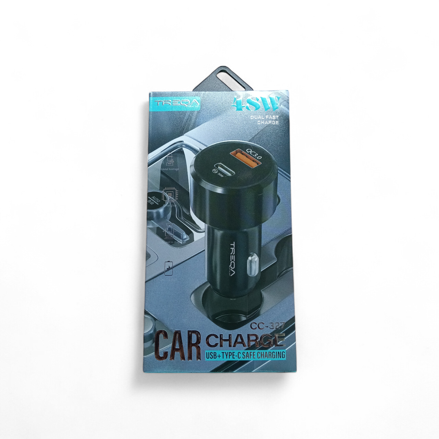 Cargador de Auto Metálico TREQA CC-327 – Carga Rápida Dual 48W (USB QC 3.0 + Tipo-C PD)